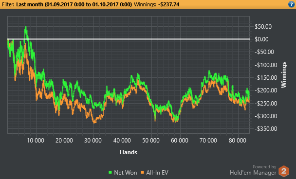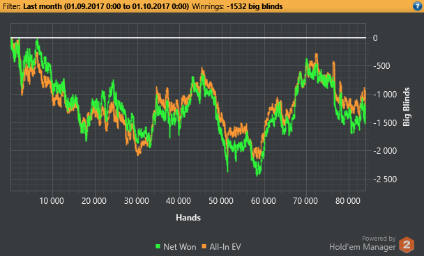 плохое: 1) месяц по профиту ужасен.... 2) целый месяц в тильте, игра несколько раз менялась...сегодня же начну читать игры разума... 3) я так и не понял из-за чего у меня бывают длинные сессии. То есть в -5би иду, отыгрываюсь в течении 4-5 часов, НО даже после того, как вышел в плюс, продолжаю играть. Конечно тут правильнее будет в корне избавиться от желания отыграться. из хорошего: 1) начал тренироваться и анализировать руки 2) понимание постфлопа стала лучше, но из-за тильта ошибки бывают крупные. 3) научился играть не больше 6 столов. 4) составил чарты, надо ли их менять, пока не знаю.