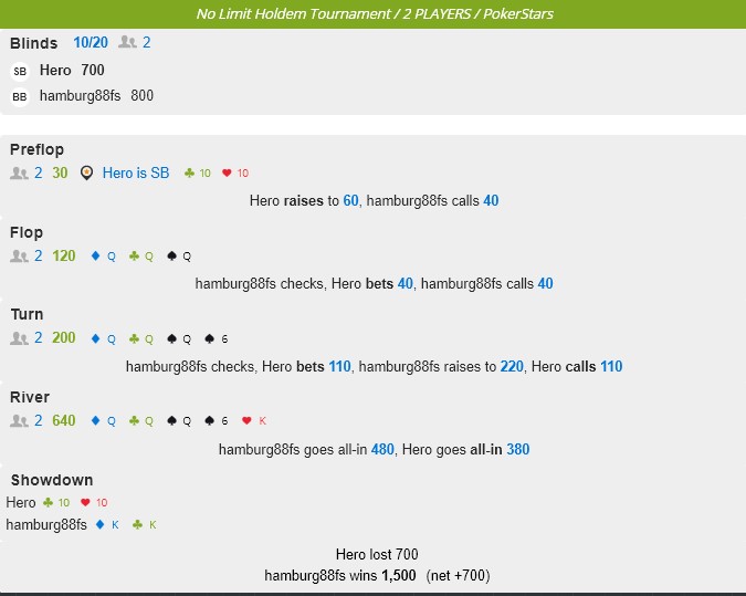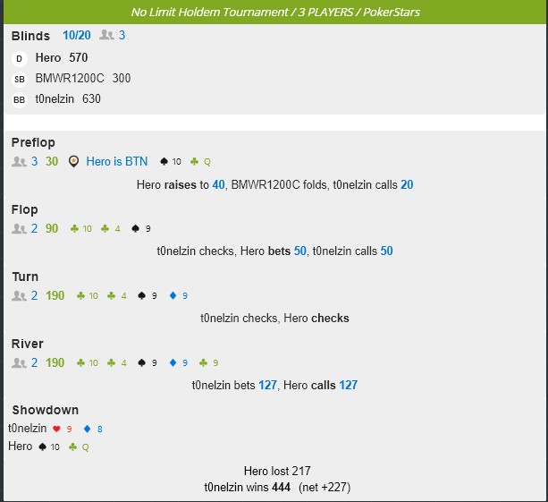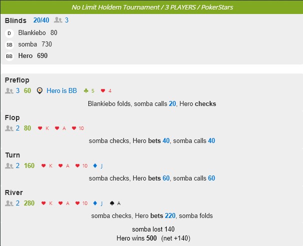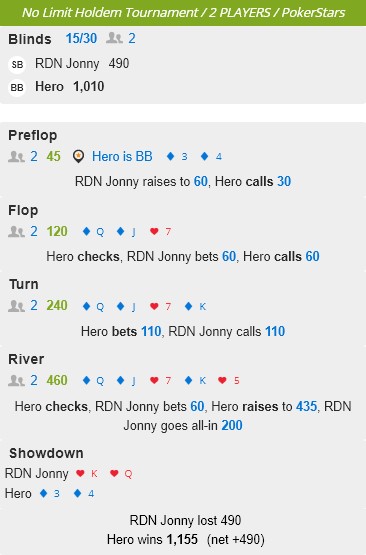 4) Флоп не торопимся, тёрн пожирнее, потому что любая трефа высокая платит опп . Ривер, правда, можно было и побольше добрать.