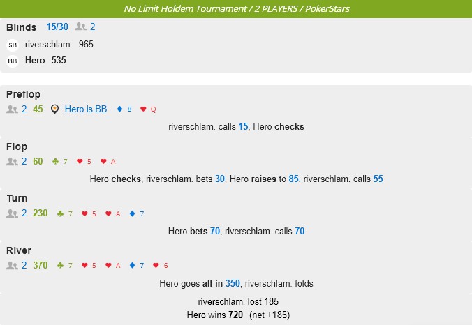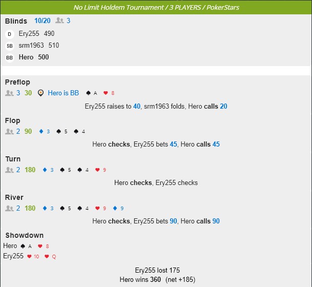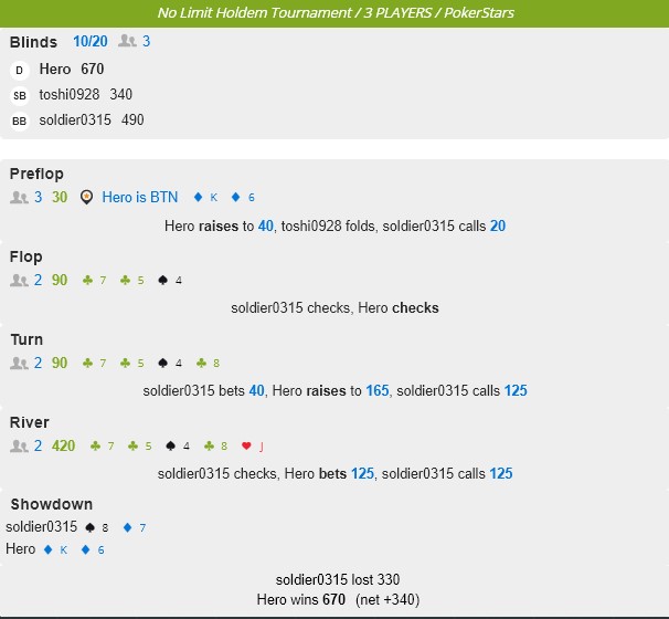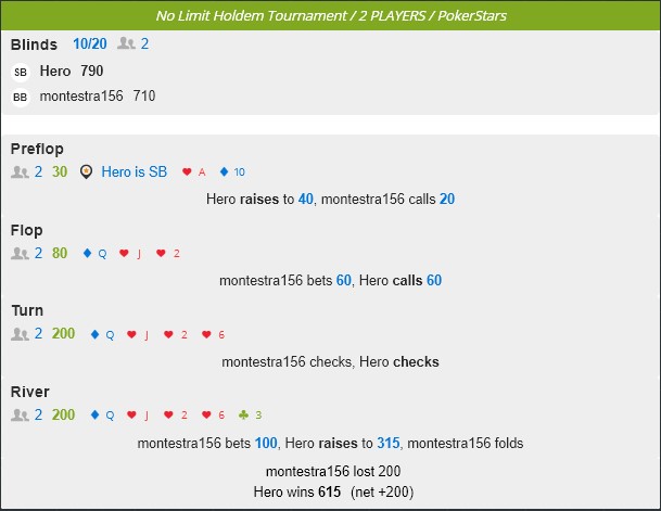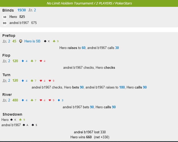 3) Оппонент - адекватный фиш (да-да, и такие бывают :D), поэтому: - чек-рейзим флоп, не совсем крупно, чтобы ФД платило (он на него практически капнут, слабые игроки в основной массе все задончат тут ФД); - мелкий бет тёрна, чтобы дать ему протащить и доехать; - ну и по пиковому риверу решение несложное