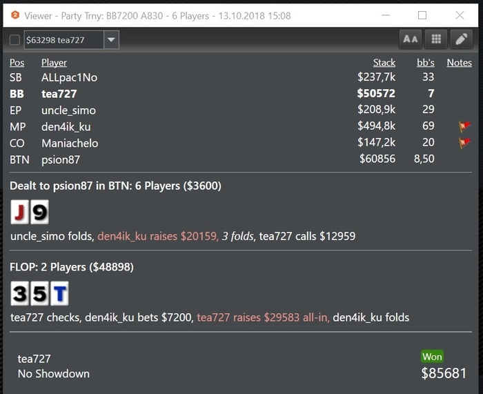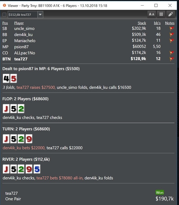 неплохо так на патипокере против меня и оппов почипдампили и потимплеили в 6макс финалке на 5 билетов по 109 два персонажа с никами tea727 и den4ik_ku. Начинали они финалку на 1 и 6 местах с разницей фишек в 10 раз+-. Сыграли друг с другом дофига постфлопа по сценарию переливания фишек от чипака к коротышу и внаглую выдавливали остальных своими мувами. В моменте без боли стали топ1 и топ2 стек офк