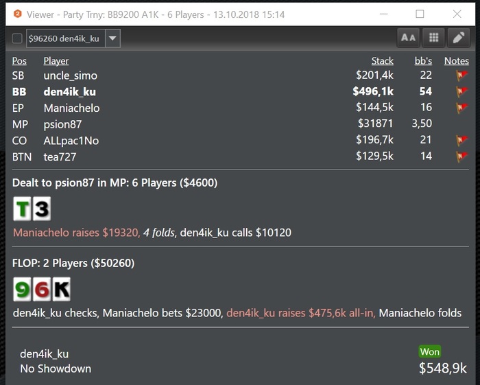 В первом же турнире с дороги финалка и вылет КК в АА по классике Через день чиповал норм тур на бабле, но проиграл все аи после итм, на предфиналке на тёрне выставился стрит в сет, ривер карета Пролез через сат в хайроллер и в очередной раз понаблюдал как любят в оффе чудить в туриках 1к+, удалось дожить до топ30 только( Всего сделал 14 прямых входов(с учетом реентри) 2 прямых входа в мэйн, оба раскачал до х4-х5 стартового ... без итм Собрал 20+ нокаутов во всех событиях В омаханоке в ключевой ривером доехал агровип с впип под100%, а потом была раздача на 6рых префлоп олл ин с моими 27-28% мимо