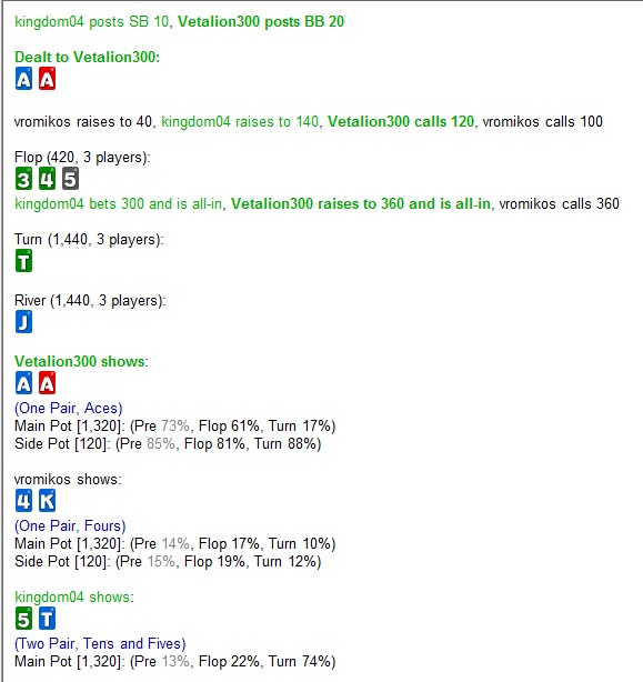 Когда связался, оказалось что у Саши только что закончилась тренировка и мы перенесли наши занятия на 2 часа. Ну я думал там будем уточнять технические моменты и договоримся о следующей тренировки. Но тренер взял "быка за рога" и захотел посмотреть на мою игру на 0,25 лимите ( он ведь не знал что деньги тю-тю). Пришлось Саше забросить мне доллар чтобы я продемонстрировал свои недюжие способности. Я отыграл четыре игры в один стол с проговариванием своих действий (иногда я вообще как оказалось не понимал своих мувов, а когда понимал то не понимал что они не годятся в конкретной ситуации счет 1:3). Пятую игру игрву с коментами тренера и объяснением причин. Потом обсуждали игру и говорили о технических моментах и софте. В связи с этим выяснилось что кое что нужно докупить и это обойдется в 28 долл.+1(который задолжал).
