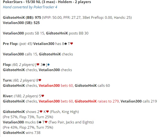 раздача с Т8 ----- на флопе надо ставить, там автопрофит так как фэ много, далее по терну я бы еще ставил полбанка на велью с фд и 3ки, а по риверу на донк его фолдил бы, и на чек его я бы чекал потоому что причины для ставки нет. По тому как сыграно, на ривере надо фолдить на его ставку, так как опп будет так переставлять с флешом фуллом или трипсом, рука слабее твоей так играть не будет без ридсов.