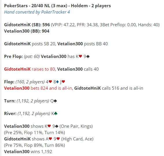 А через пару раздач был для него роковой мисклик (на флопе я подумал что у меня К8 и зарядил) и неожиданно доехал.