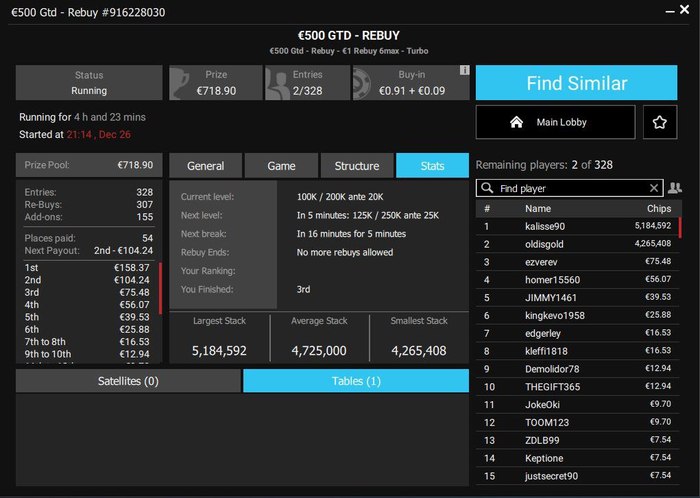 Однако если откинуть этот геморойный интервал времени, то я катаю на буднях 2-3 раза в неделю саты (2-3шт) на пати по 5$ и 11$ это EASY, отбираюсь на 55-й реже на 109-й, пытаюсь доехать там в выходные. Периодически, пару раз в месяц, когда особенно шкура трещит, выбираюсь на офлайн турики по 2000-3000 р + ребай+аддон (6000-8000 руб), бывает доезжаю.