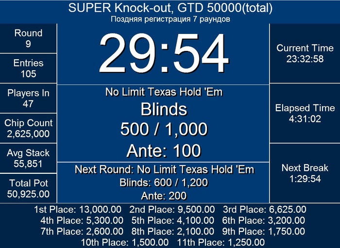 Финишировал турнир. Всего сделали 54 входа, призовой фонд составил 35235: 1) Хамид Рееда 10500 2) Коробкин Николай 8000 3) Лизин Николай 6835 4) Ляхов Сергей 4000 5) Лавров Максим 2700 6) Смирнов Владимир 1900 7) Мартыненко Максим 1300 Поздравляем победителей!!!