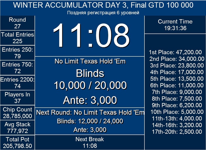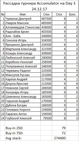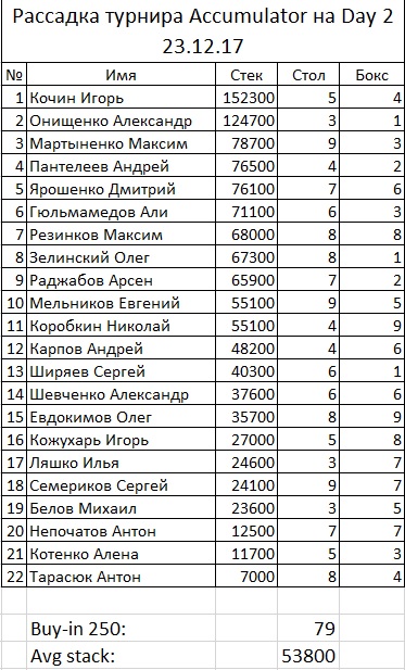 Сегодня уже отыграли первый день турнира Accumulator. Сделали 79 входов, в игре осталось 22 человека. Рассадка на второй день через несколько часов. Сейчас идет регистрация на турнир Escalator.
