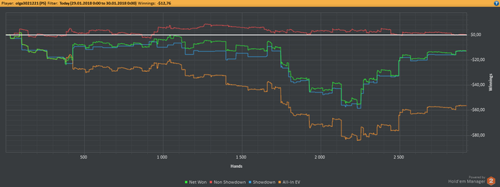 profit77788 @ 29.1.2018 Очень много мелких ошибок. 1. Тяну дро не по шансам 2. Колирую ставки не по шансам, чтобы посмотреть терн или ривер 3. Влюбляюсь в свои руки 4. Даю оппам по шансам посмотреть терн или ривер (боюсь, если много поставлю скинут в пас) В общем еще куча мелочи, с которой надо бороться.
