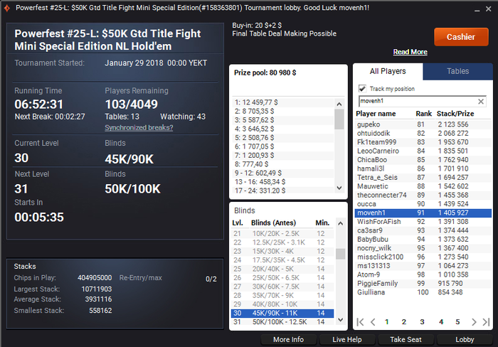 Ну что, скатался на разведку...так как кеш получается слишком дорогой для моего бр(60-180р), буду катать все турниры, что смогу(кроме хайроллеров). Видал сегодня турнирного директора patypoker)))