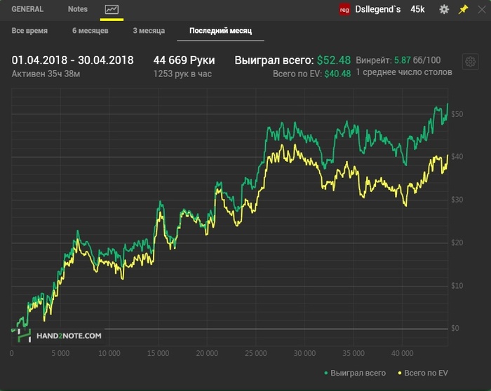 Вот и подходит к концу апрель, который почти весь я занимался хуйней важными делами. Но это уже в прошлом нужно двигаться дальше. Итог месяца: Общая длина сессий 45h 41m / Кол-во рук (44 669) Прикрепляю итог сегодняшнего дня и профит за месяц. Все руки за апрель сыграны на NL2. Завтра едим дальше.