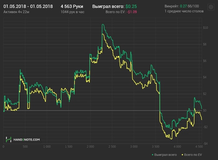Всем привет. Пропадал я по разным причинам: А) Хотел поиграть в олдовую игру месяцок на новом серве, но серв загнулся за 12 дней. Б) Компу стало плохо и он просто висел на окне "Добро Пожаловать" либо прогружался, но виден был лишь курсор мыши на черном экране. Пофиксил это. С) Были личные дела. Ну а теперь, разобравшись со всем, могу продолжать свой марафон. Кстати говоря, этот месяц я не совсем филонил, а занимался теорией, теперь пришло время и для практики. Играть начал с 25.04 Вот результаты за три дня. 25 - откатал час с хвостиком 26 - 4h 25m 27- 3h 52m Сегодня 7h 50m Итог Длина Сессии/ Кол-во рук/ Профит / Профит по EV $ (График за 4 дня)