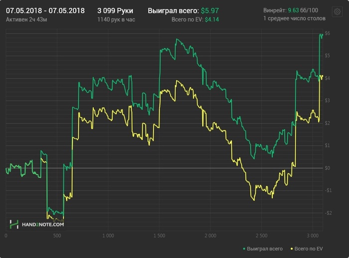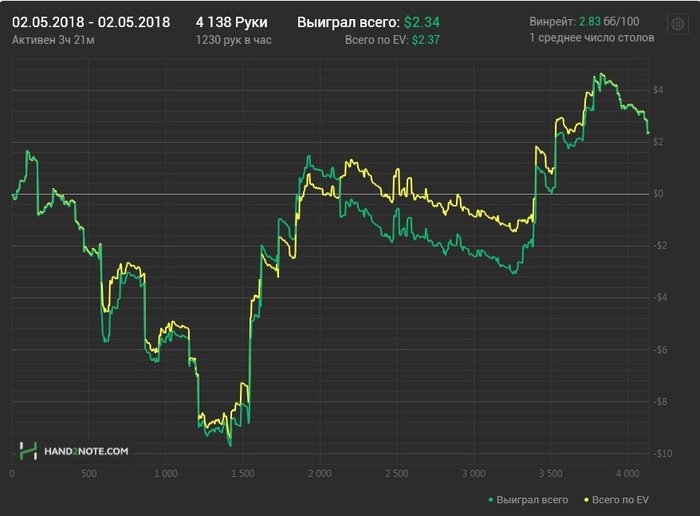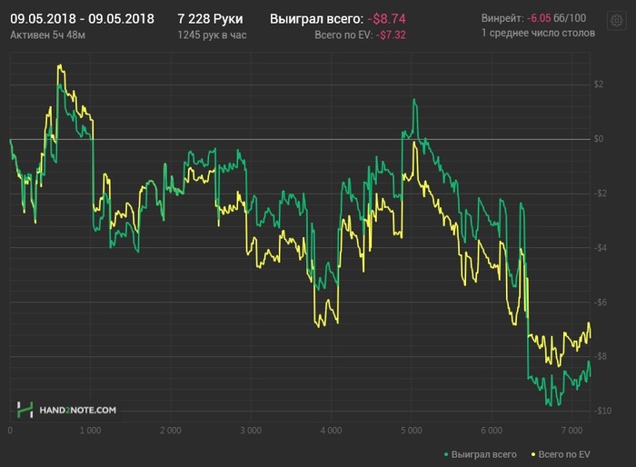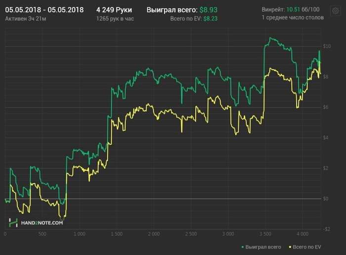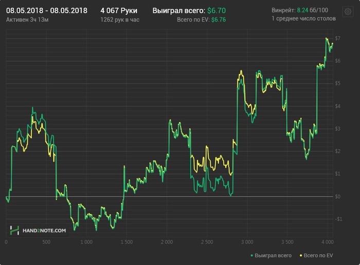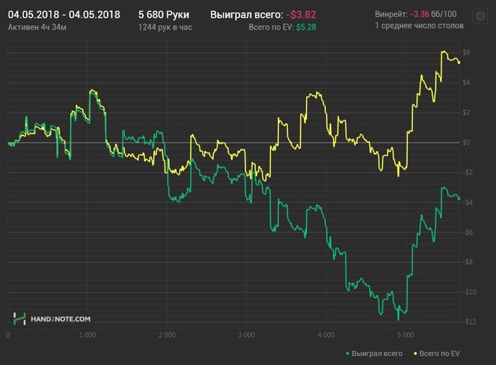 Сегодня видать еще был отголосок вчерашнего дня, но хотя бы в конце поправил ситуацию. Играл не сильно хорошо, так по среднему, местами правда с ошибками, но куда без них. EV$ кстати в +, соответственно могу сетовать на простой стрик. Не получилось сегодня забрать упущенного, зато хотя бы новое не отдал. Ничего все впереди.