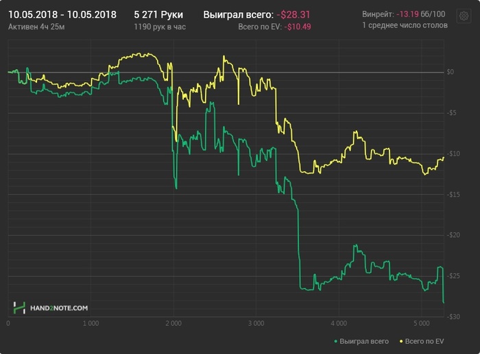 Сегодня был тяжелый день, допускал ошибки разной степени тяжести, (Коллы когда уже позади в 99,99% случаев; или "Интересно, а мне доедет два аута из колоды?" и в этом духе), а иногда и просто переезжали. Но я смог отбить общий график за день фактически в 0. P.S собрал свой четвертый флеш рояль :-) Итог: Длина Сессии/ Кол-во рук/ Профит / Профит по EV $