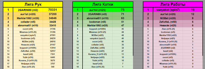 В лиге катки разыгрывались 50 долларов за топ-3 (25/15/10). Такой щедрый подарок привлек внимание регов нл25-50, которые и разделили призовой фонд. 3 место занял ZaKoNaL (126 часов), 2 - aur1st (142), а победителем стал Mizamax (144 часа).
