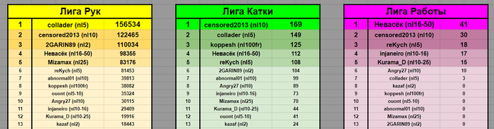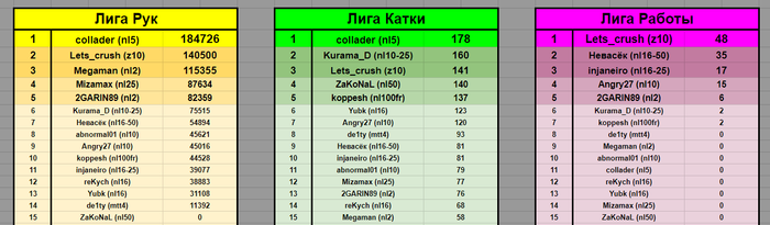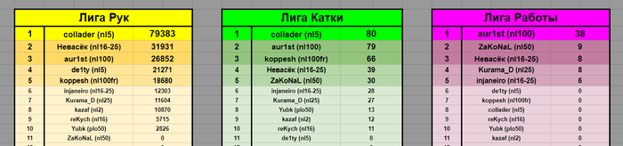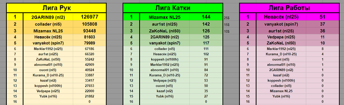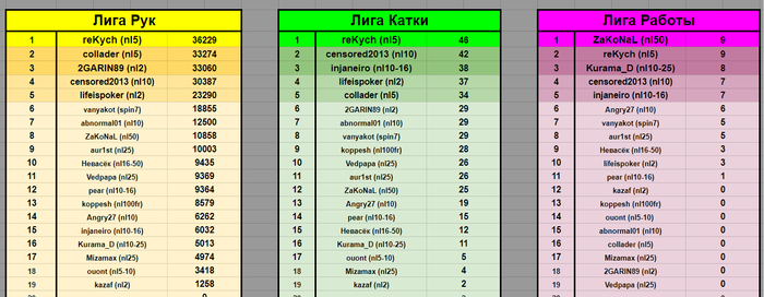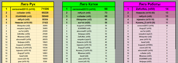 В лиге рук и лиге катки победил некто collader потративший целых 178 часов жизни на борьбу с регами нл5 (и откатавший за это время 184к раздач).