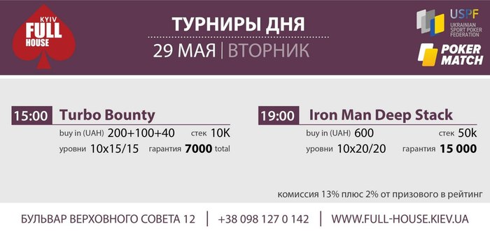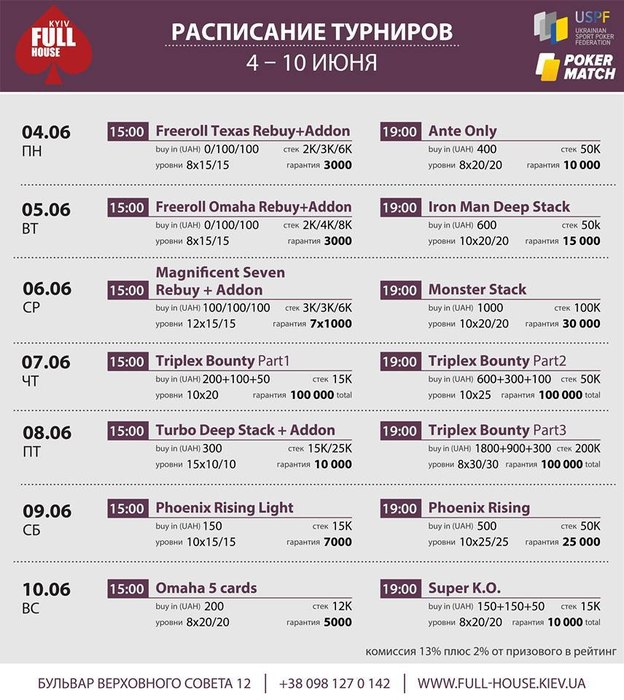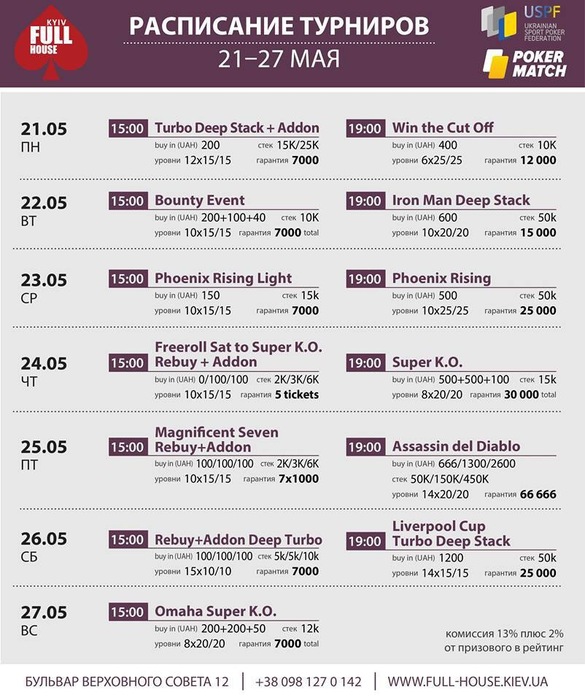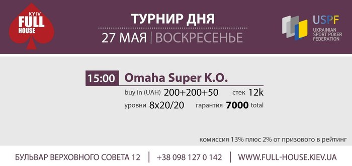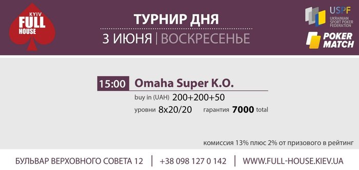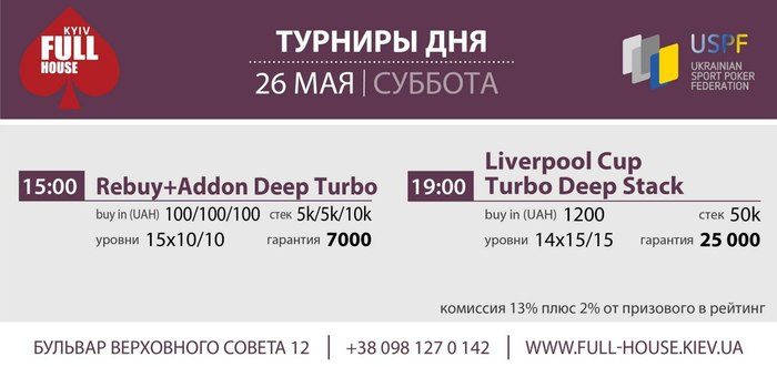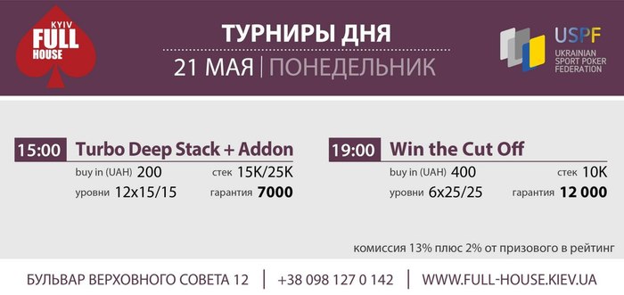 Добрый день! Большая просьба к организаторам. Крупные турниры с плавной структурой (например такие как был 2.06.) начинать не в 19:00, а в 15:00. Так как играть до 8 утра (как было 2.06.) многие не имеют возможности. А так, и тем игрокам, кто не может начать днём, благодаря поздней регистрации (около 4 часов с учётом перерывов) будет возможность зайти в турнир до 19:00.