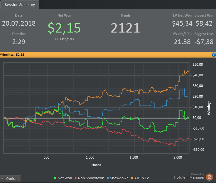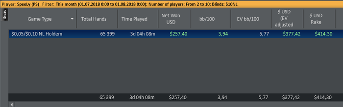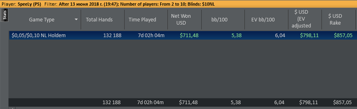 ButovoEPT @ 12.7.2018 Всем привет народ, давненько уже не было постов с графиками и отчетами . Пришло время исправлять ситуацию С 13 июня я полностью ушел из zoom нл10 и кэщ нл16 и начал осваивать новую для себя дисциплину поз названием Шоу Тайм) Решил сразу начать с нл10 т..к. БР позволял и на вход надо всего то 50бб . Главная задача была перестроить полностью свою игру со 100бб стеков на 50бб, отличия есть и их довольно много. Учился честно говоря прямо в процессе игры, методом проб и ошибок, работу проделал огромную, 1) Оптимизировал свои ренджи для 50бб стеков 2) Позадрачивал пуш фолд против конкретных опонентов 3)Разобрал игру топ регов лимита и понял за счет чего они делают деньги На самом деле отличия топ рега от обычного рега незначительно, просто они знают в каких ситуациях выгодно додавить или наоборот заоверфолдить хорошие руки вот и все) Поэтому бояться их не надо. За месяц отыграл дистанцию в 100к рук что для меня довольно много, с учетом что обычно я играю 6 столов но в процессе игры количество увеличилось до 9 без потери качества, пробовал и 12 столов но для шоу тайма это ту матч на мой взгляд, только Мегаман умеет 20 столов играть в ++)) Респект если читаешь этот пост. Обьективно оцениваю по 10 бальной шкале свою катку гдето на 6.5, уж очень много я делал дорогих ошибок , тильтовал, устраивал ненужную пиханину и на всех этих действиях потерял баксов 250-300. Но в итоге откала эти 100к рук почти в 6ев/бб на 100 И считаю это вполне годным результатом с учетом того, что тренера у меня нету и во всем разбирался сам. По ощущениям этот лимит можно бить спокойно в 9-10бб если не тупить и играть строго по страте. На этом останавливаться не собираюсь, следущ цель скопить БР для Нл25 и пытаться закрепиться на нем, надеюсь этот пост хоть както смотивирует вас к развитию и уже наконецто выйдите вы с нл2-5 на лимиты выше, сам начинал 3 мес назад нл2 и выше гораздо интеренее пасаны. Ставьте + к посту и задавайте интересующие вопросы по дисциплине, чем смогу помогу)))