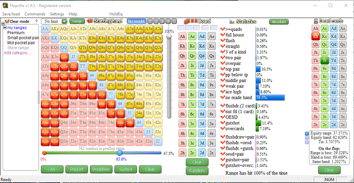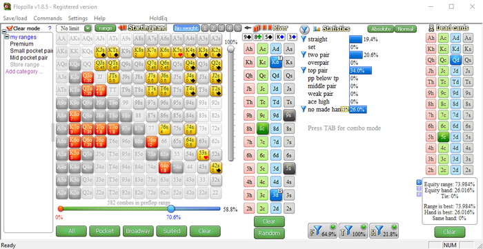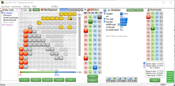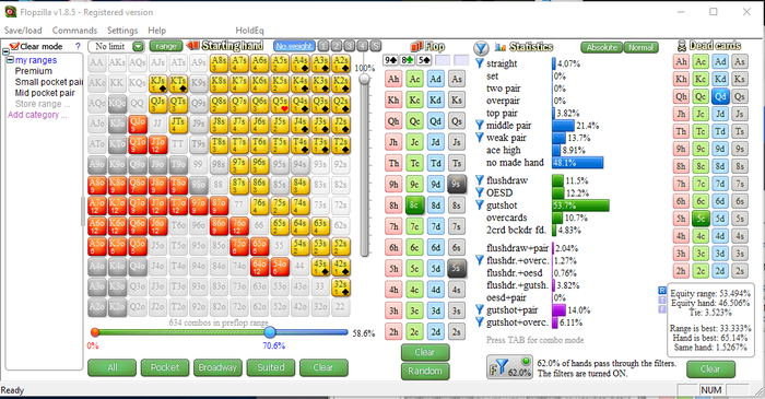 Я выставил во флопзилле примерный впип поля в 70% (без расчетов). Убрал оттуда диапазона 3бет-пуша. Далее выставил структуру флопа и убрал две пары из диапазона кола кбет, посчитав что если что-то и будет чек-рейзить на таком борде, так это они (а возможно и они будут в коле).