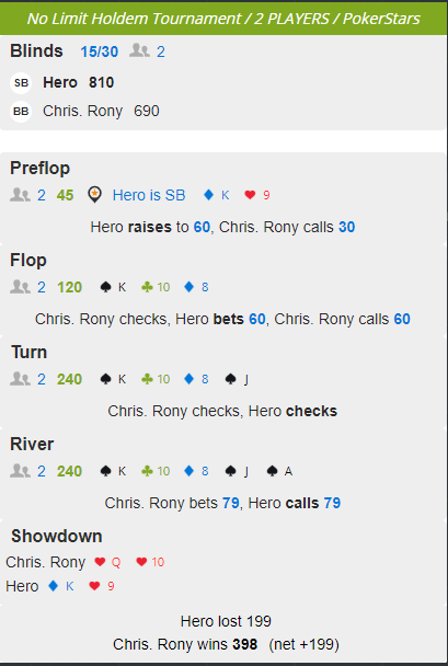 Поэтому, лучшим полем для отработки и практики подобных приемов будут ХАСНГ (турбо или рег спид). Каждому игроку, ЛЮБОЙ дисциплины, я рекомендую играть в день 5-10 ХАСНГ турниров на лимите, который ниже рабочего лимита вашей дисциплины на 1 или 2 шага.