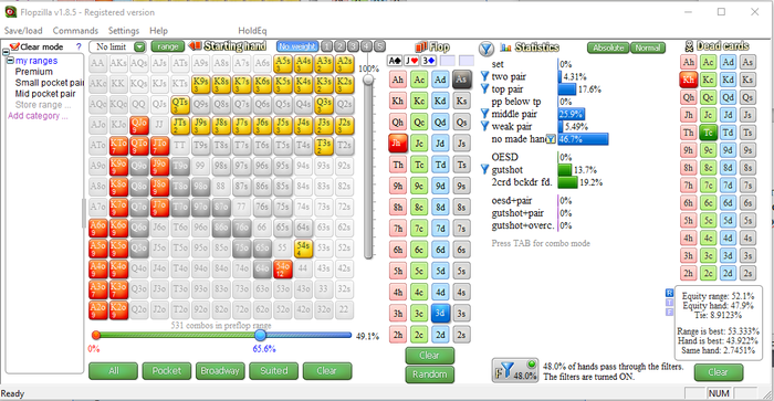Пре: HU. Эфф стэк — 25 ББ (стартовый). Сделан ПФР 2 бб. Опп делает кол. Исходя из тенденций поля, Call опа на ББ +-44% (ВПИП на ББ у ср опа (в данной ситуации) — 65%, из которых 21% - 3bet, Call – 44%; показатели примерные, поэтому во флопзилле все выставляем в соответствии со здравым смыслом). Исключаем из диапазона кола: 22-AA; A6s/A7o-AK;K10s/Qjs-KQ.
