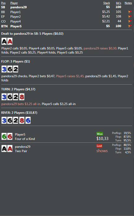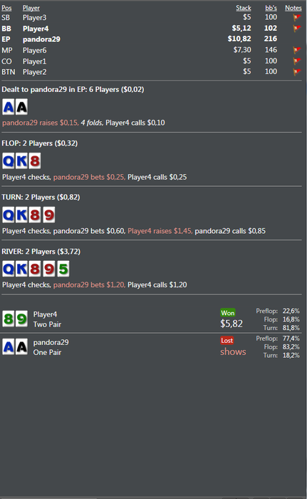 я бы в этой раздаче зарыл АА на флопе, ладно еще с одним оппом, но с двумя тяжковато, учитывая то что мы не много вложили денег в пот... советую избегать таких сложных спотов...