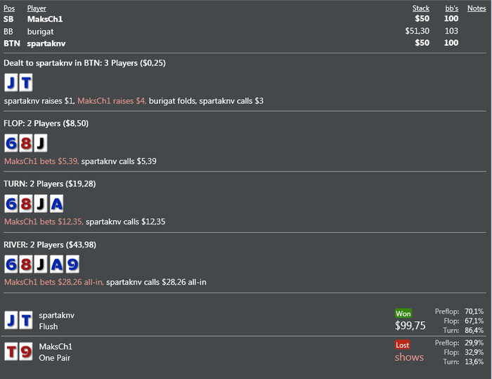 BELGAZ, Не, я так не думаю, возможно даже неплохо, с учетом его имиджа, просто раздача неплохо попала в контекст) Но, думаю, что если брать дефолт - он сыграл так себе, рука для блеф-пуша как по мне не очень подходящая, он ничего из моего велью не блочит вообще. Однако, если брать в расчет конкретного оппа, а против него бы я бы задумался есть ли тут колл у А6,А8,А9 и тогда уже блеф с натяжкой, но пролезает.