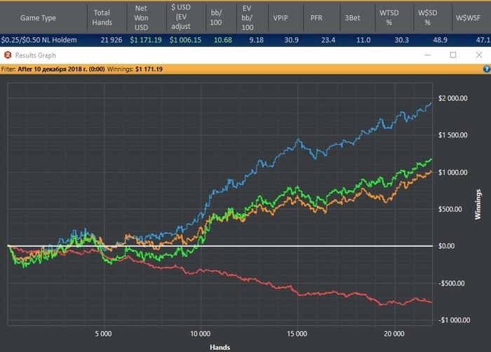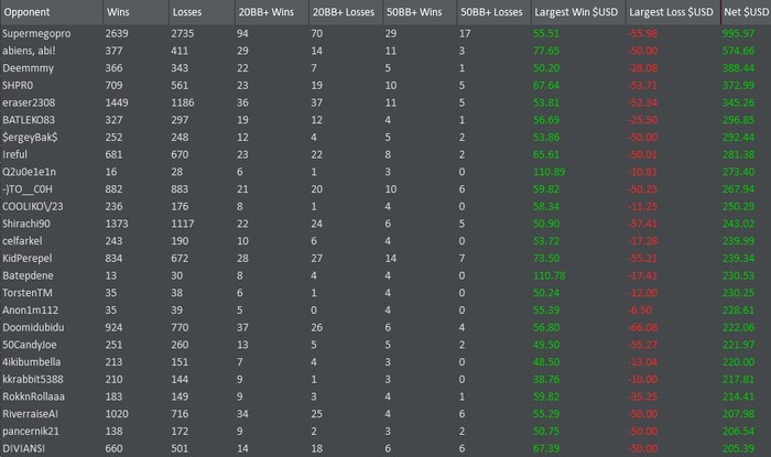 Месяц подходит к концу, 100к наиграть не удалось. Немного болел, немного предновогодних хлопот, ну и просто лень... 163 часа на сегодня. Вообще мой максимум - часов 200-220, так что в целом 163 часа вполне неплохо. Бывают месяцы и по 50-100 часов. В целом за год 1268 часов, что по 105 часов в среднем. Но в этом году много уделял времени теории, анализу. 534к рук. В следующем году хотелось бы более продуктивно поработать, 150 часов в среднем было бы отлично. Весь год отыграл на нл50, с редкими шотами(неудачными) на нл100. Опять на днях немало проанализировал, прогнал базу по разным фильтрам. И опять много мыслей по перестройке некоторых аспектов игры. Также немного поразбирал регов, с которыми часто играю, возможно отчасти получится лучше под них подстроится. Посмотрел на своих "врагов" и "друзей", вот они у меня какие. "Друзья"