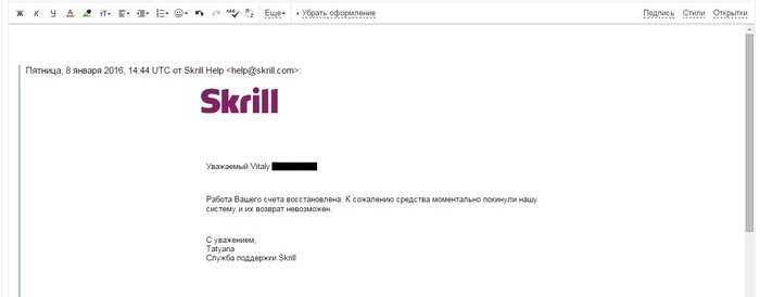 "Мы временно заблокировали некоторые платежные опции в целях безопасности Вашего аккаунта. Мы обратились тоже к отделу безопасности на счет Ваших транзакций, дождитесь ответа в течении двух рабочих дней на счет этого вопроса.