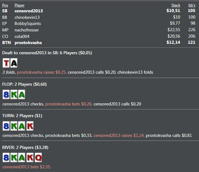 Ты не понял логику моих действий. Я не ждал колла от рук хуже, я ждал фолда от стрита. То, что у оппа стрит, это ясно и то что не натсовый стрит - это тоже ясно, так как с натсовым, по такой доске, он ставит контбет, а тут прочекал. То что у оппа нет флеша тоже понятно. За это говорят 3 фактора.