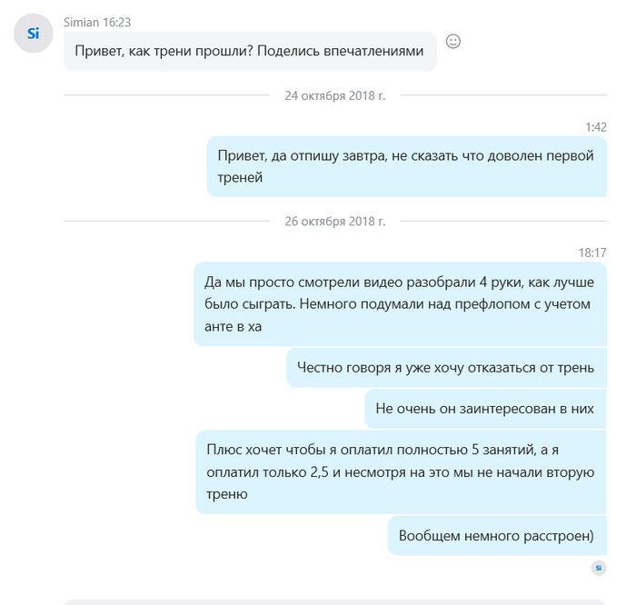 Все эти попытки съехать на "дорбую волю тренера" бледно выглядят, надеюсь Сергей не будет ничего выплачивать и ТС попадет на всю сумму, у нас довольно специфическая сфера деятельности и много побочных факторов\уточнений, но тут все совершенно точно, ТС хотел взять тренировки, получил первую, понял что слишком дорого\тратить время лень и решил слиться, это спускать нельзя.