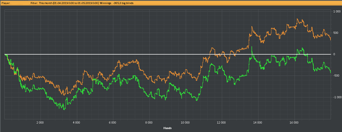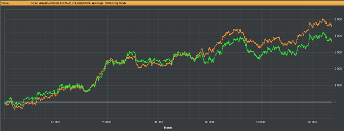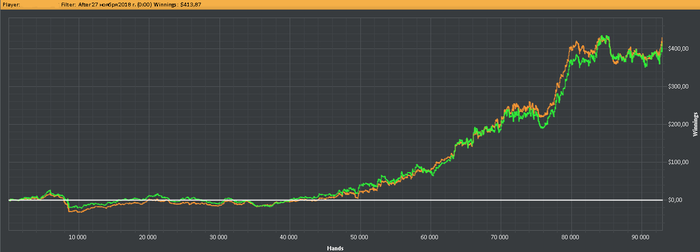 Я был удивлен, что не получил фолд на ривере, слишком мало рук презентую походу, оппонент довольно нитовый 12\10 и втсд там 26 показывало на худе, я отдавал себе отчет что там скорее оверпара чем к примеру 99, плюс у меня блокеры на его АА и КК и тут либо просто не проканало, либо я заблуждаюсь в этой ситуации.