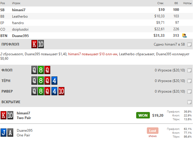 Duane395. Опять на ривере с не самым слабым трипсом с оверкартой на доске с незакрытыми дровами против фиша не могу упасть. Да, после этой раздачи я уже стал доверять его рейзам по риверу, но даже с учётом этого в подобной ситуации я скорее буду неправ, если буду падать с такой рукой. Платим и плачем