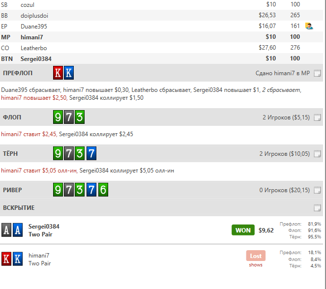 2). Этот же оппонент 12бб оупенрейз, трибет на велью. На постфлопе у меня СПР=1, на агрессию при условии, что борд не будет для меня ухудшаться, я не упаду. Прочекали до ривера, ривер бланк, ничего не закрылось, хочу добрать в валета, карманок 66-ТТ и натыкаюсь на рейз. На самом деле решение сложное, с одной стороны колл тильтовый, я не учёл выигрыш на шоудауне от оппонента, с другой-тут почти нет велью рук кроме 3х, которые до ривера не давали о себе знать+шансы банка ок. 16%. По опыту против фишей могу сказать, что там достаточно часто будут блефы или превращения среднего шд в блеф, хотя со второй парой мне не приходилось почти вскрывать таких игроков