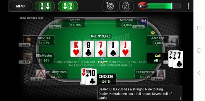 снова префлоп и 9 ривер))не хочу слить все за месяц,так как уже был опыт за месяц минус 1000бачей.Думаю возвращаться на свои лимиты и играть максимум по 3.30,в выходные можно и по 5.50 запускать(также можно через саты но не много,а то как сегодня из за них в минус 30)самая главная цель выработать в себе контроль над эмоциями а потом уже вторым делом побыстрее подниматься по лимитам-как говорится тише едешь дальше будешь!! У вас были моменты когда вы много выигрывали и шли на лимит больше,и не могли остановится чтоб снизить???