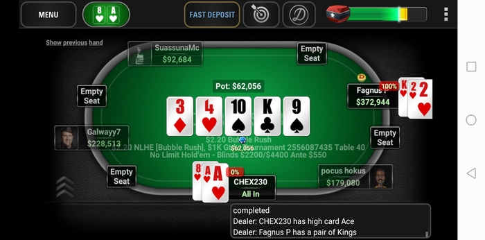 chex230 @ 13.3.2019 снова префлоп и 9 ривер))не хочу слить все за месяц,так как уже был опыт за месяц минус 1000бачей.Думаю возвращаться на свои лимиты и играть максимум по 3.30,в выходные можно и по 5.50 запускать(также можно через саты но не много,а то как сегодня из за них в минус 30)самая главная цель выработать в себе контроль над эмоциями а потом уже вторым делом побыстрее подниматься по лимитам-как говорится тише едешь дальше будешь!! У вас были моменты когда вы много выигрывали и шли на лимит больше,и не могли остановится чтоб снизить???