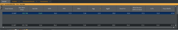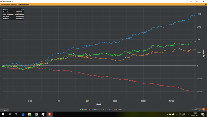 По графику винрейта видно, что красная линия у меня сильно идет вниз, знаю что у многих она отрицательно. Но у меня по ней походу пике Думаю или недоблефовываю или оверфолжу. А может и то и другое вместе взятое. Как время будет попробую разобрать базу по фильтру "без ШД".