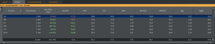 Привет! Почитал, понравились мысли. Статы тоже понравились)) Глгл в твоем начинании! Совет: пока нет особого смысла тратить время на разбор своих сессий. На этом лимите ты не должен долго задерживаться даже с минимальными знаниями. Если играешь всего по 5 туриков, то есть время прям во время сессии подумать над проигранной/выигранной раздачей. А уж если есть своя конфа, то быстренько скинул туда руку на обдумку и дальше катать. Позже уже легче будет разобраться с уже заранее выбранными раздачами, нежели копаться во всей сессии. Сейчас цель одна - набить банкрол! Учиться покеру будем позже