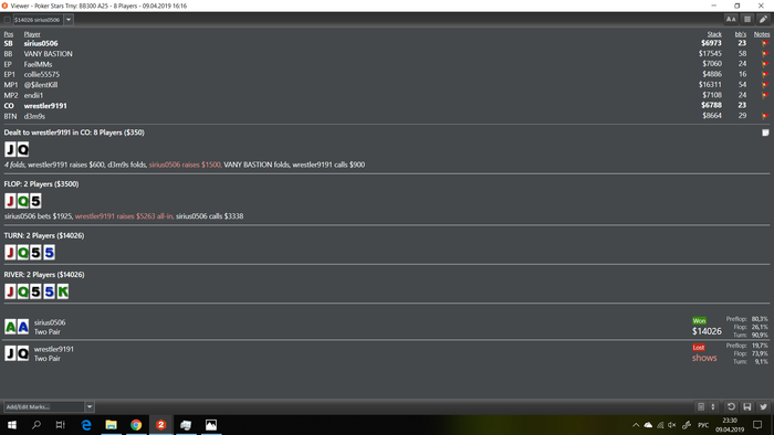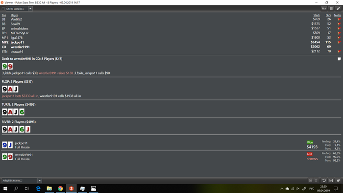 Сегодня прям день очень болезненных переездов. Два из них прям на бабле одновременно на двух столах. А играл я всего 3 стола. Притом шел с комфортными стеками и там и там. От злости вырвал наушники из ноута и кинул куда-то. Потом минут 10 искал Но это было реально очень больно