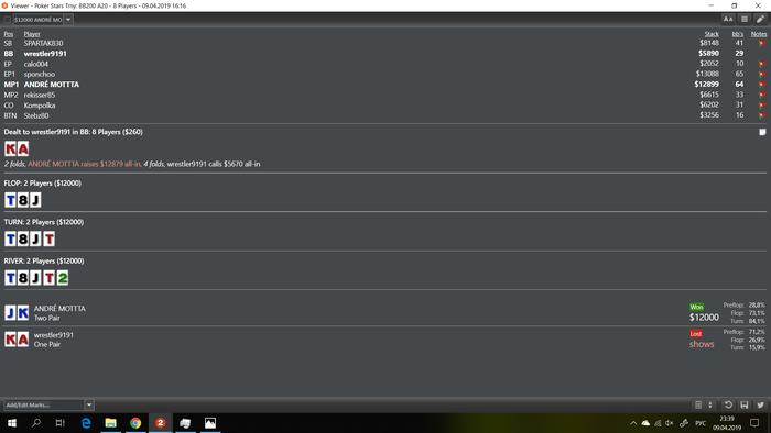Скрины решил не выкладывать в СНГшках, ибо кому они нафиг нужны? Когда начну МТТшки катать и реально заносить, тогда будет смысл. А так впустую эти заходы в призы выкладывать). Сегодня на финалке на 4 месте вылетел с комфортным стеком, сыграв ну очень плохо. Минут 5 не мог успокоиться из-за своей тупости((. Но так ладно, главное по меньше творить такую херню.