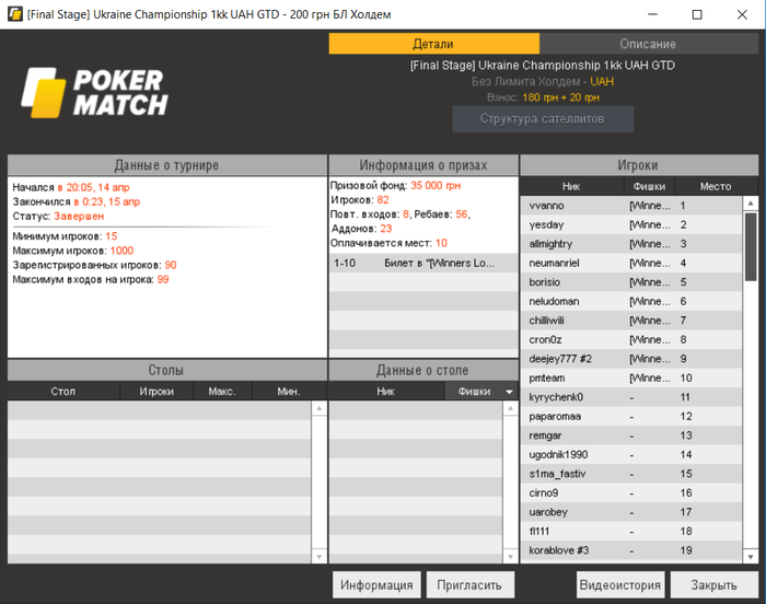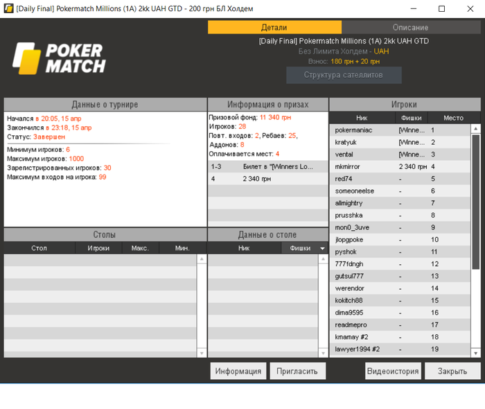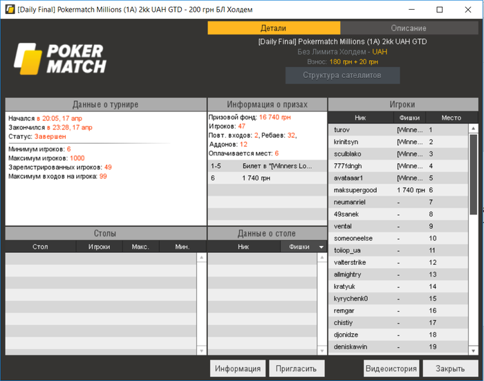 Отличная игра! Всего в турнир с призовым фондом 2,000,000 гривен разыграли уже 59 путевок! Сателлиты на PokerMatch проходят каждый день. Включайтесь в борьбу!