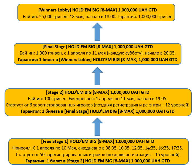 Уверены, что и на серии, и в турнире Khreschatyk Poker Open вы сможете прочувствовать ауру этого места. В турнире будет 5 отборочных флайтов с бай-ином 900 гривен и финальный раунд, в который можно будет вступить за 8 900 гривен! Гарантия — 1 500 000 гривен! Ну и, конечно, почет и слава чемпиону турнира!