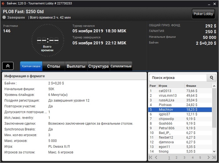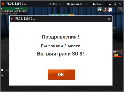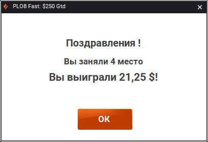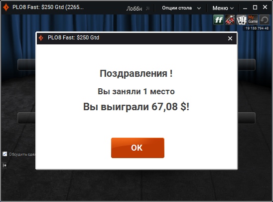 Итак, хочу поделится важным событием, очень важным для меня. Я завершил свой марафон!!! Да, это случилось намного быстрее, чем я ожидал (т.к. забросил его и начал с 9 сентября). Учитывая мой прогресс мне бы хотелось сделать это до 9 ноября 2019г, но получилось сегодня, ведь я выиграл турнир за 2.20 PLO8 Fast на PartyPoker. Много раз занимал третье место, один раз второе, а на финалки сколько раз выходил, но все не получалось, много тупил, но сегодня залетел на финалку с настроем выиграть, и полюс 4 фиша за столом) Было достаточно просто, много блефовал по флопу, т.к. позволяли ребята, ну и складывалость неплохо, разок словил с флопа абсолютный натс - Стрит-флеш А--5, даже неплохо добрать получилось. В общем, безумно рад тому, что у меня получилось меньше, чем за 2 месяца (49 дней) пройти марафон играя турниры 0.44-2.20$ только на пати. Это мой первый значительный заработок в жизни, и я очень рад, что удалось сделать это в интернете, не впахивая на работе, да зачастую жертвовал сном, спал по 3 часа, потом ходил на 5 пар и садился за столы, потому что я безумно хотел это сделать, и у меня получилось! Дальше-больше! Начинаю подгружать новый турнир по хай лоу омахе, за 4.40$, Bankroll 363$/350$ P.S. Пока не знаю, как правильно сделать, запустить марафон новый уже поставив цель "чистый профит" или же продолжить этот? Скорее всего буду пробовать делать по профиту, и заводить ли новую тему? или продолжать тут