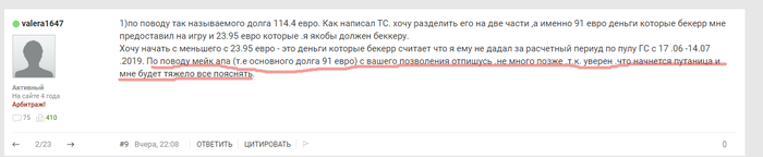 Лео.Я может неправильно выражаюсь.Смотри 91 евро это деньги которые я должен беккеру.И которые я проиграл.Потом обратился за следуэщим траншем. но он мне отказал.И потребовал вернуть 91 евро. А что косаеться 69 евро то это деньги которые я закидывал ранее после проигрыша преведущих 91 евро и отыгрывал их (т.к беккер мне не перевел) и тоже на них ушел в минус.Вот про них я и писал ранее 91+69=160.или ты считаешь .что я их не должен вносить (я про69 своих)