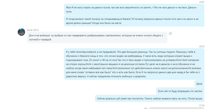 Не смотря на это я соглашался с его требованием на мейкап.Но он начал беспредел вводя какие то новые формулы по расчету (я писал о них все выше).И начал пугать меня арбитражом.И путая всех сейчас. Теперь я думаю всем понятно почему я играл на свои.А когда один раз обратился за средствами то получил отказ.Хотя я до этого отыгрывал 3 раза его мейкап за свои деньги и делил с ним профит согласно договору. У меня вопрос ко всем кто читает эту ветку .беккеры .игроки.модеры: это нормально? Вообщем вам решать я размениваться не буду.решите .что я не прав и нужно отдавать значит буду отдавать.Вам же потом беккать и беккаться. Отдельное спасибо .одному человеку с форума. который. поверил мне и дал денег на игру.И пока еще работает со мной.Если б не он .то как вы себе это представляете?Я имею ввиду мейкап если его придется отдавать