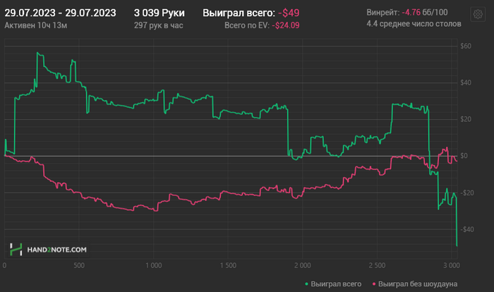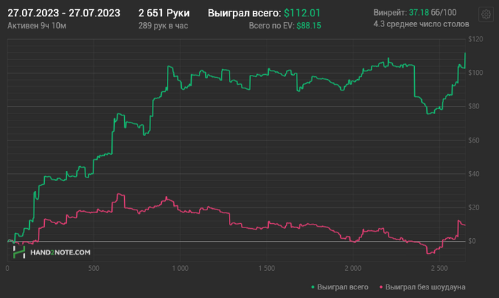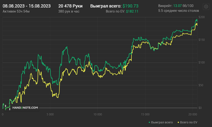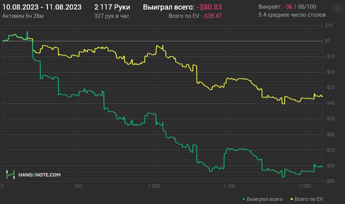 Около 25 часов вышло. Х2Н заметил теряет руки с впн периодически (хотя я не играю бомб поты, но видимо и на обычных теряет), граф не отражает всей картины (плюсом еще около 35$), но это не критично, РБ и прочие плюшки я не учитываю в отчетах.