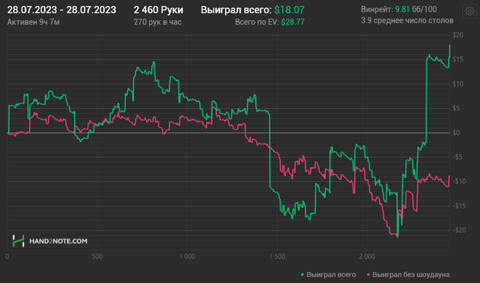 Сегодня так покатал, первая сессия прошла отлично, везде успевал и старался думать но то и понятно, мало столов было (мало - это 9 🙄) , а вот ближе к вечеру на пике открыл от жадности 15 и снова начал улетать в автопилот.., чувствую долго придется переучиваться от бесполезного нитового гринда, хотя конечно страта рабочая, но не выше нл10: