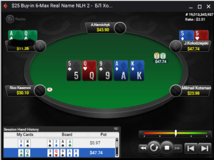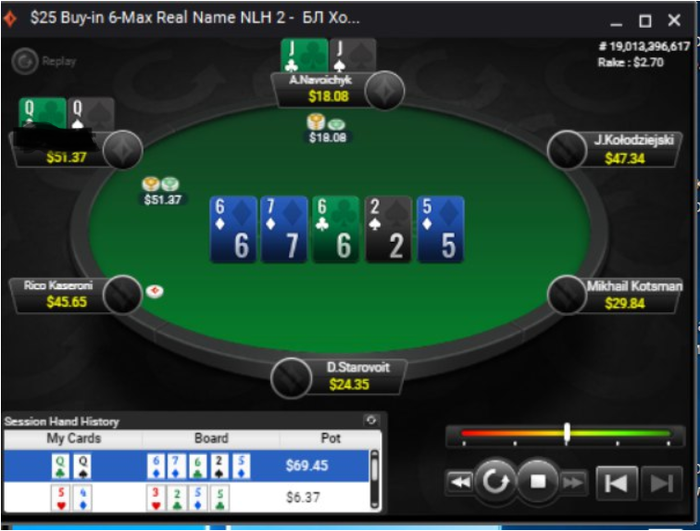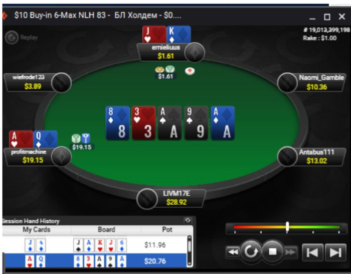 Ну что ребятушки, катаю Нл 25, стараюсь не зарубаться с регами, максимально избегаю войны с неизвестными, играю в тайтовый покер. Пока заходит +- хорошо, даже больше в мою сторону. Играю 4-5 столов, концентрация на высоте, стараюсь не смотреть резы во время сессии, очень помогает. Сегодня даже что-то выиграл, результаты все покажу в конце недели:) Вот подборка интересных раздач. 1)Трибет банк, нам просто кулернуло 2)Этот же парниша, второй стэк у него отжал:) не стал 3бетить ТТ, хотя это, думаю, лучшее решение. Сыграл ч.р флопа х2.5, плотный бет терн. По вышедшему тузу чекнул. Думал у него все таки JJ QQ, но он запушил, и я скрепя зубами нажал кол 3)Не знаю почему, не затрибетил с сб AQs, в итоге отдал стэк. Зарейзил терн, но ривер нужно рыть, даже АК доехало, а он пушит, но я 4)Нотс на парня, что он слоуплеит АА, рег опен с СО, я трибет, от него 4бет в холодную, не стал пушить, забоялся, верхний лимит же для меня еще. В итоге просто зафлоатил, он сам все сделал. 5)Против випа, трибет банк. Кол пот бета от него, чек терн. И я чекнул ривер, дав его рукам волю 6)Почему-то пока что не получается слоуплей, хоть и понимаю что на дистанции это плюсово, так как ты заставляешь слабых оппонентов ошибаться и делать подобные действия. Мы опен с BU, фиш кол на СБ, рег сквиз, я просто кол, многие бы 4 бет, но таким образом мы убираем из банка фиша, а нам это не надо. В итоге на низком борде рег 1/4, я х3 рейз, фиш пушит. Все по красоте, но ему доехало. Не страшно, так как сыграно, КМК, хорошо.