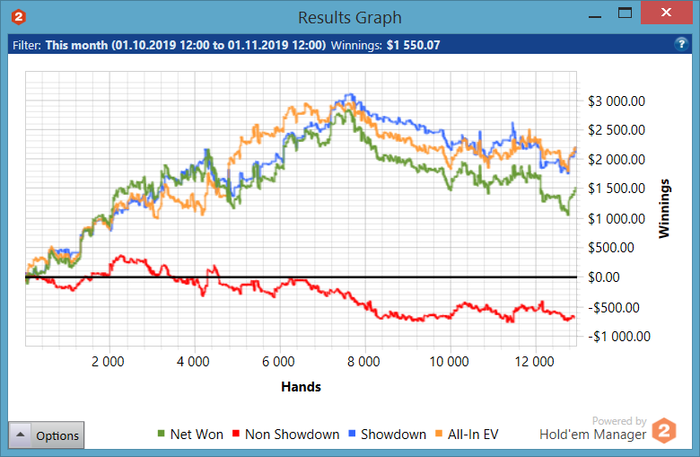 surtr @ 23.10.2019 3-я неделя: Сыграно 29 часов. Устал (стал мало спать, просыпаюсь и не могу заснуть), поэтому играл плохо, даже банально путал свои карты, борд и т.п.