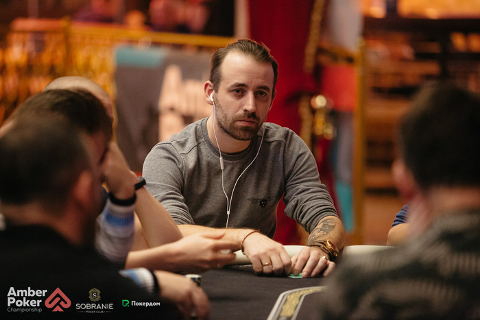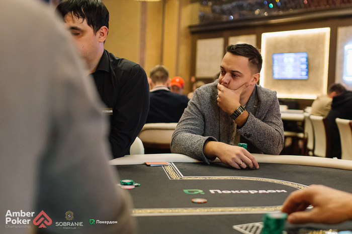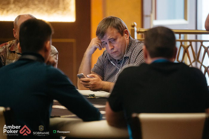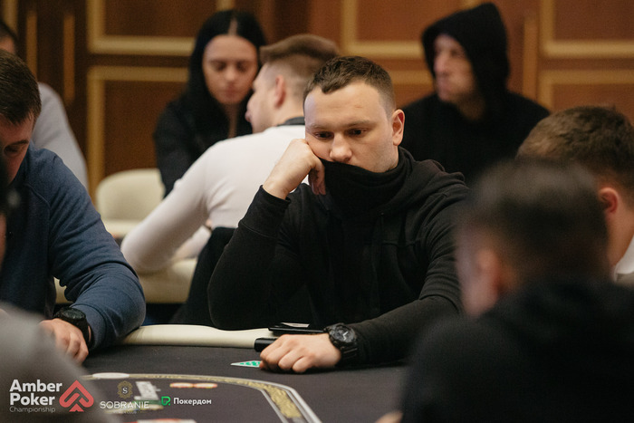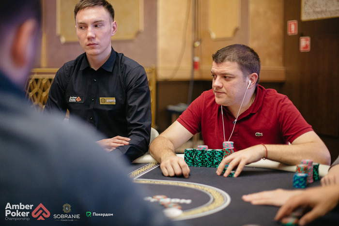 Сергей Альбицкий с карманными дамами выбил Максима Галстяна, у которого были , а Игорь Рыбак за другим столом удвоился с карманными пятёрками и стало около 15 блайндов.