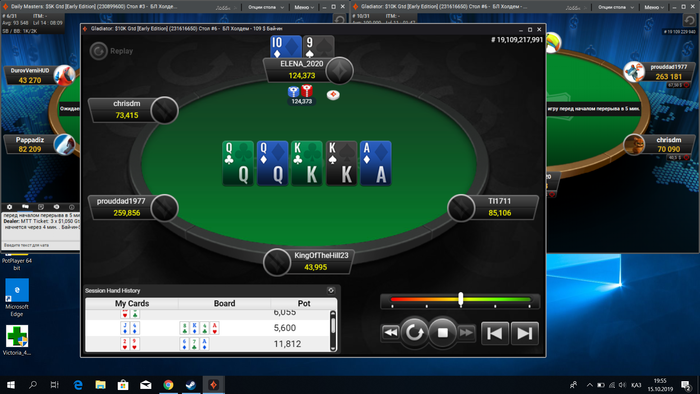 не знаю как карты показать играю гладика за 109 стек где то 45бб был ну вообщем оп с утг делает мини рейз я с конекторами делаю калл тут бб делает 3бет утг пасс флоп такой вышел ))) ну мы на флопе чек чек потом терн ставить пол банка я калл ривер А ну он делает чек я сделал пуш он пасс )))))))))))